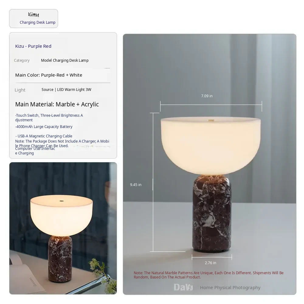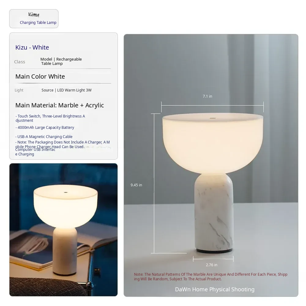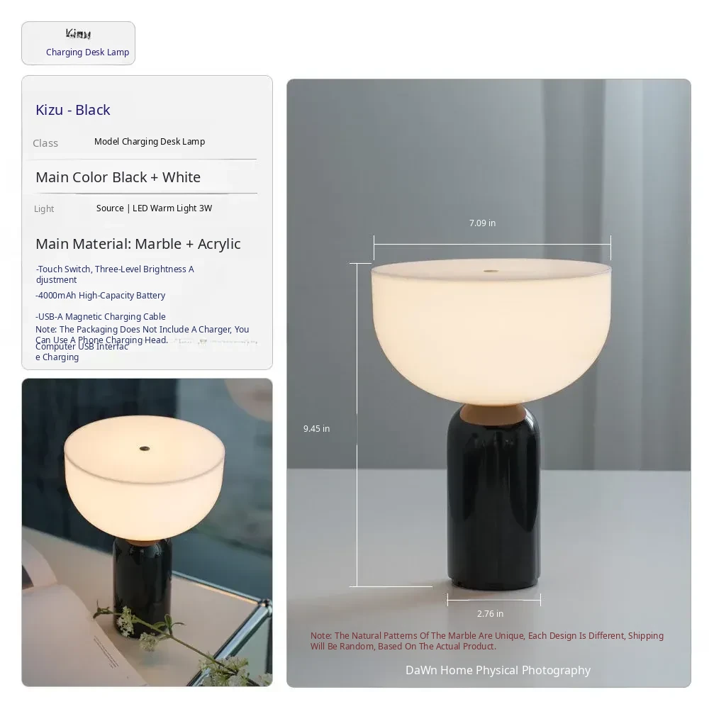 Danish Kizu Touch Table Lamp - Elegant Marble Design for Bedroom, Living Room & Study - Rechargeable & Luxurious French Style Nightstand Light