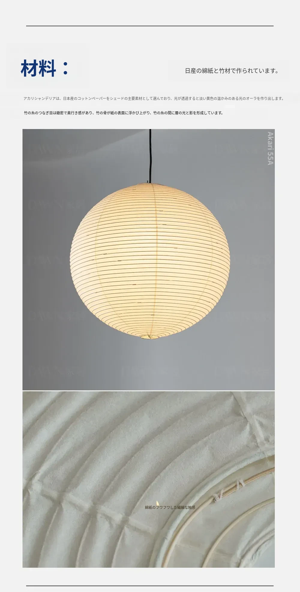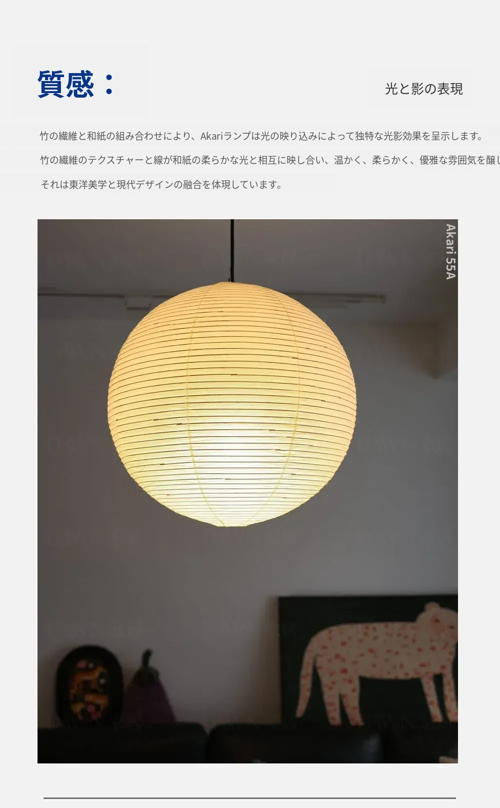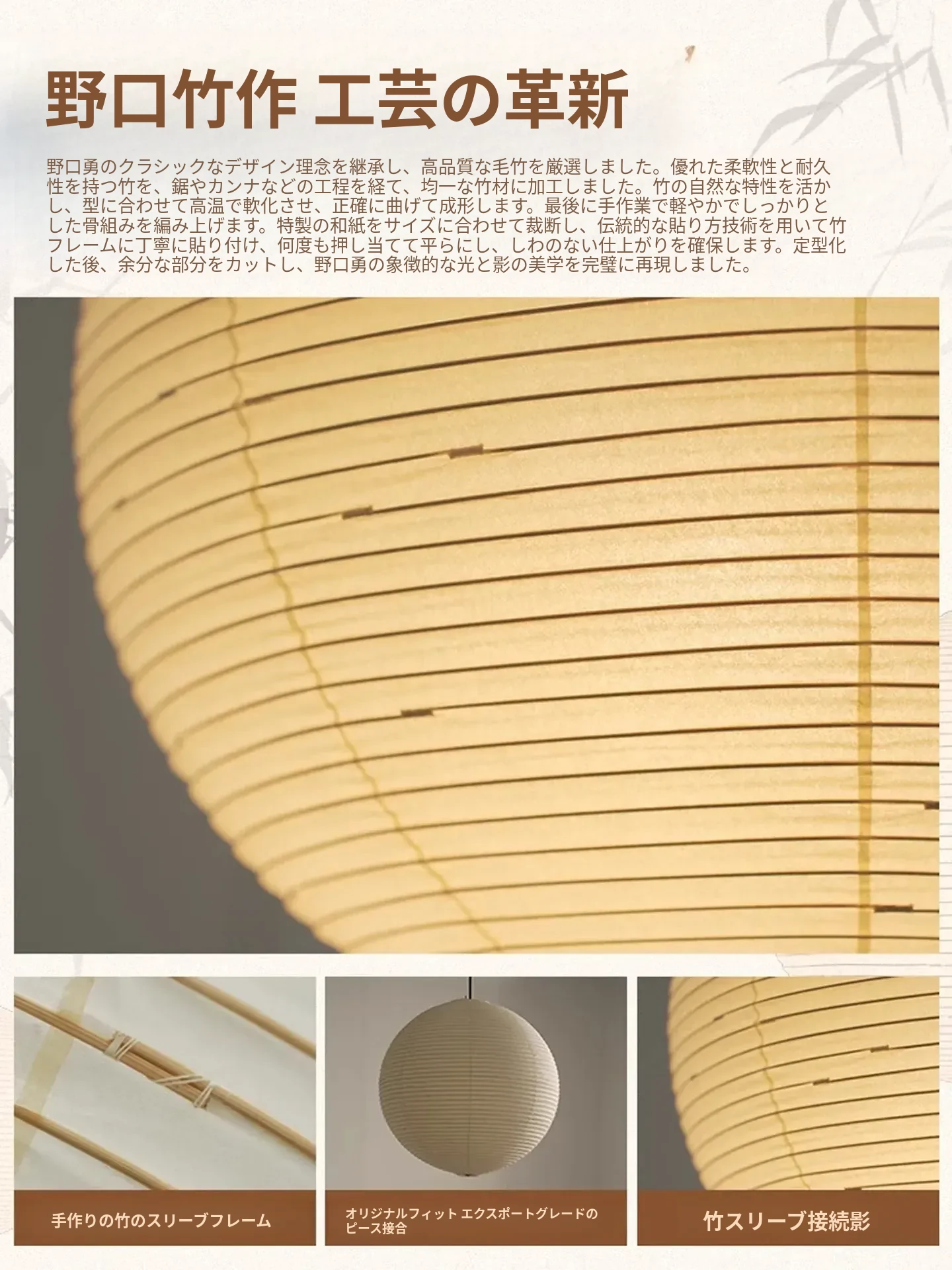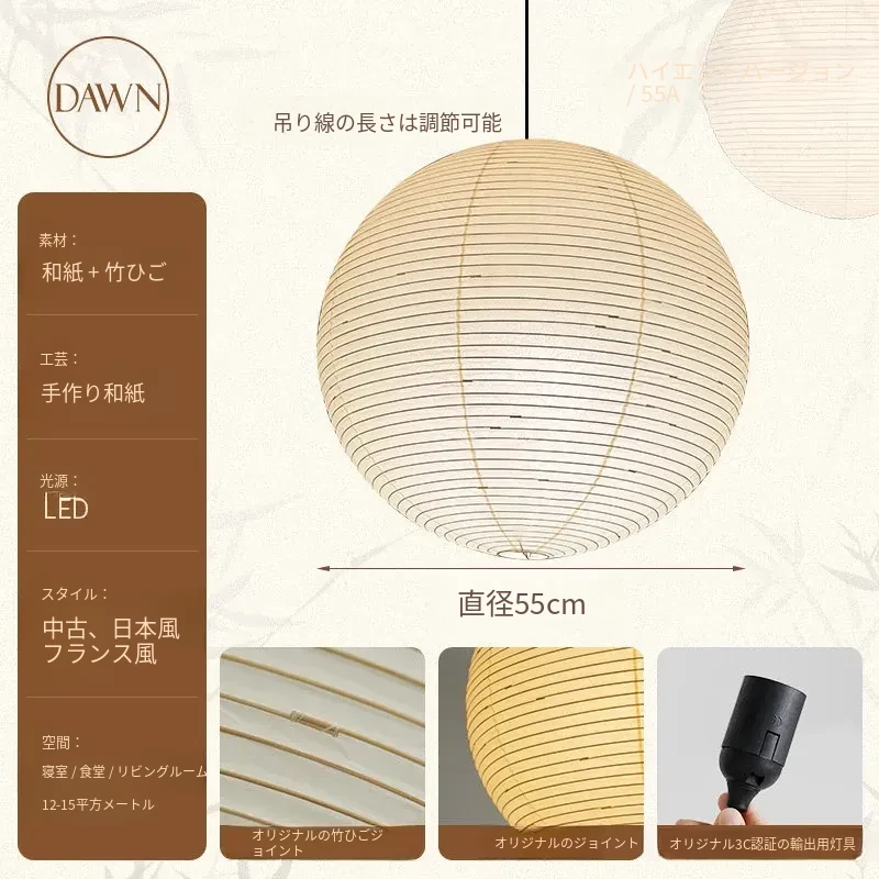 野口勇デザインの55A竹編みシャンデリア - 和の心を感じる現代的な丸型ライト。リビングやダイニング、主寝室や茶室に最適なシンプルで洗練されたインテリアアイテム。民宿にもぴったり!